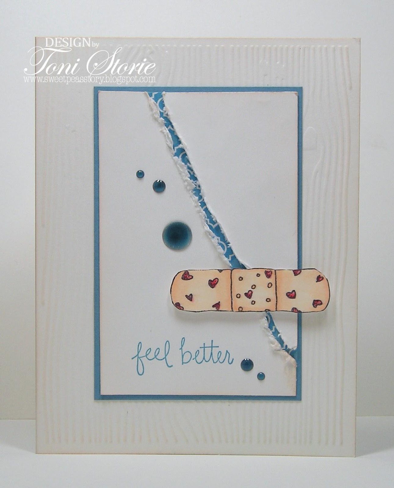 Here's my card for today's Ways To Use It challenge. Lisa chose a theme of Ways To Use get well cards. I have seen some really cute cards with band-aids. I wanted to do something simple for my card. However, I just kept fussing and fussing and fussing with it. I started with some coloring. Then, I moved on to tearing and distressing. Next up, I did some embossing and distressing. Finally, I added some epoxy stickers and called it done.